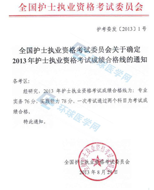 摘要 2013年護士士執業資格考試分數線已公布,環球網校醫學網根據中國衛生人才網最新信息得知:2013年護士執業資格考試成績合格線為:專業實務76分,實踐能力78分。一次考試通過兩個科目為考試成績合格。
