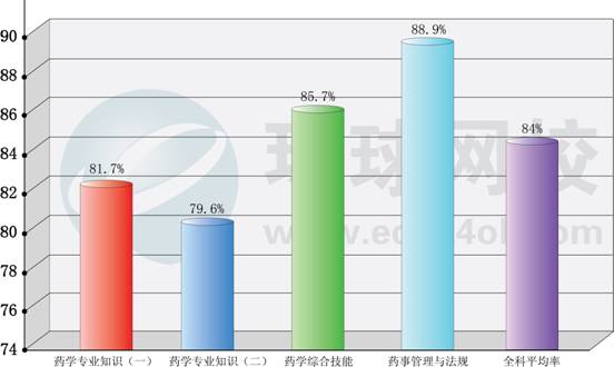 藥學專業知識(一)為81.7%,藥學專業知識(二)為79.6%,藥學綜合知識與技能為85.7%,藥學管理與法規為88.9%,全科平均為84%。