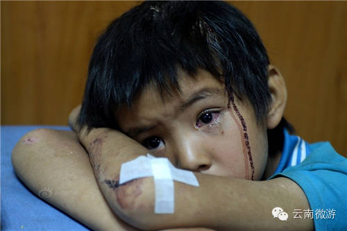 【震后不眠夜】8月3日深夜,一位孩子在魯甸縣人民醫院接受醫治。當天晚上,當地居民為避免余震,在街頭露宿,度過震后首個不眠夜。攝影:胡超