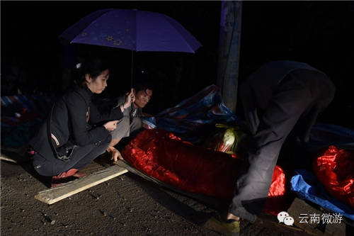【最后的守護】8月4日晚,云南魯甸,家屬守護在遇難者的遺體旁。夜里下起了雨,村民們用塑料布遮住親人的遺體。供圖:CFP