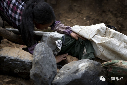 【長眠的孩子】8月4日,云南魯甸縣龍頭山鎮營盤村,地震中失去三歲兒子的普菊,摸著孩子的額頭,卻再也不能喚醒他。攝影:曲鳴飛