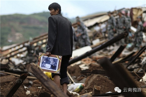 【失去的家園】8月4日,云南魯甸縣龍頭山鎮,一位男子站在已成廢墟的家園上,手里拿著家人的照片。供圖:CFP