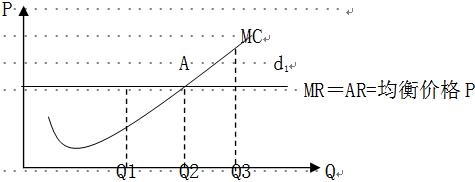 短期邊際成本與邊際收益曲線交于A點,A點左側邊際成本小于邊際收益,企業會提高產量,增加利潤。A點右側,邊際成本大于邊際收益,企業會減少產量,以增加利潤或減少虧損,在A點邊際成本=邊際收益,此時企業既不能增加產量也不能減少產量,即在A點上實現了利潤最大化.