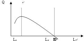 (2)L1后邊際產(chǎn)量遞減,繼續(xù)增加勞動(dòng)投入到L3,MP=0. 如果再增加勞動(dòng)投入,邊際產(chǎn)量為負(fù)值。(勞動(dòng)相對(duì)過剩,資本不足,勞動(dòng)的邊際產(chǎn)量下降。達(dá)到L3,增加單位勞動(dòng)帶來的邊際產(chǎn)品為0,勞動(dòng)量繼續(xù)增加就必然出現(xiàn)人浮于事的狀態(tài),勞動(dòng)邊際產(chǎn)品為負(fù)值,即增加勞動(dòng)不僅不能增加產(chǎn)出,反而會(huì)導(dǎo)致總產(chǎn)量下降。)