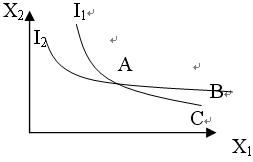 A、B均位于I2,AB偏好相同;BC均位于 I1,BC偏好形同,根據偏好的可傳遞性,B與C的偏好相同,但這是不可能的,因為B比C具有更多的X2,根據多多益善假定,B必定比C更受偏好。因此無差異曲線不能相交。