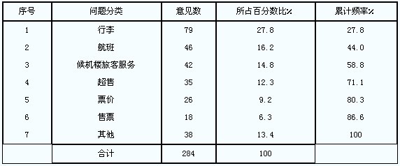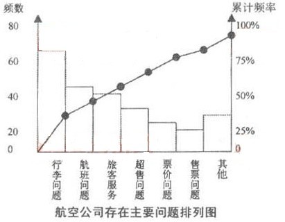 從排列圖可以看出該航空公司存在的主要問題是行李問題、航班問題、旅客服務問題、超售問題和票價問題,其累計頻率達到80.3%。因此可作為質量突破的目標。