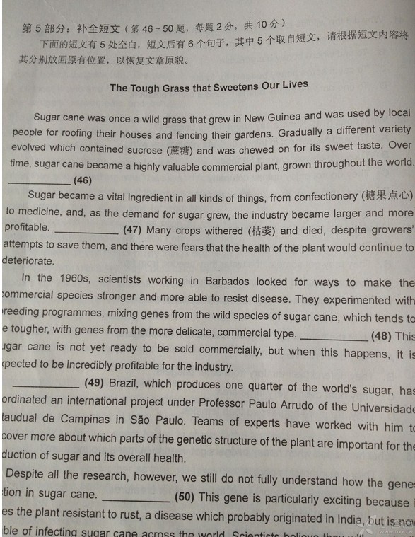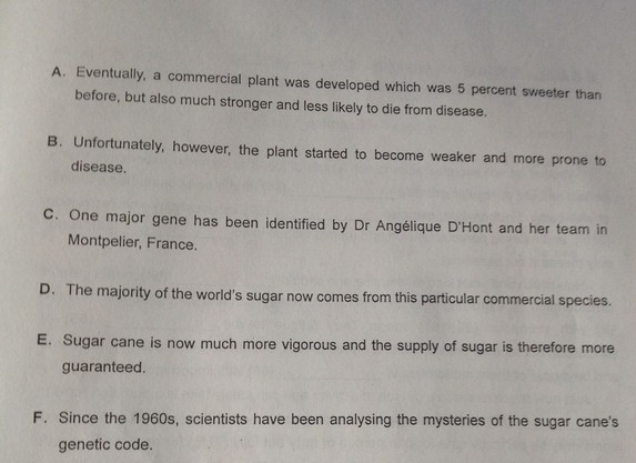 4、F. Since the 1960s, scientists have been analyzing the mysteries of the sugar cane’s genetic code.