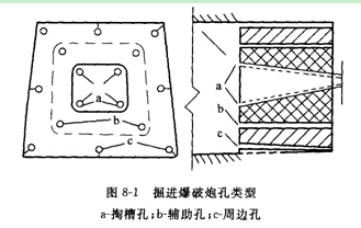 根據坑道斷面、巖石性質和地質構造等條件,掏槽眼排列形式有很多種,總的可分成斜眼掏槽和直眼掏槽兩大類。