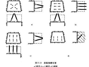 (1)斜眼掏槽:其特點是掏槽眼與開挖面斜交。常用的有錐形掏槽,楔形掏槽,單向掏糟,其中最常用的是豎楔形掏槽。斜眼掏槽的優點是可以按巖層的實際情況選擇掏槽方式和掏槽角度,容易把巖石拋出,而且所需掏槽眼的個數較少。缺點是眼深受坑道斷面尺寸的限制,也不便于多臺鉆機同時鑿巖。