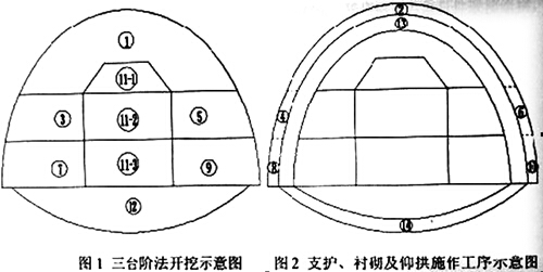 該地段地質條件復雜,勘探表明其圍巖主要為弱風化硬質頁巖,屬IV~V 級圍巖,穩定性差。由于地下水發育,特別斷層地帶巖石破碎,裂隙發育,為保證施工安全,施工單位在該遂道施工中采用了超前地質預報,并進行監控量測。根據該隧道的地質條件和開挖斷面,施工單位在施工組織設計中擬采用二臺階法施工,左線隧道施工工序劃分如圖1、圖2所示。