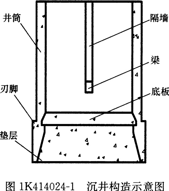 沉井的組成部分包括井筒、刃腳、隔墻、梁、底板,如圖1K414024-1所示。