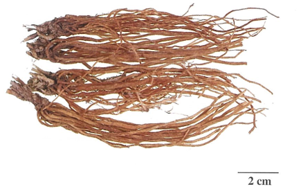 圖6為茜草,茜草藥材根莖呈結節狀,叢生粗細不等的根。根呈圓柱形略彎曲或扭曲。表面紅棕色或暗棕色,皮部易剝落,露出黃紅色木部。斷面皮部狹,紫紅色,木部寬廣,淺黃紅色,導管孔多數。氣微,味微苦,久嚼刺舌。
